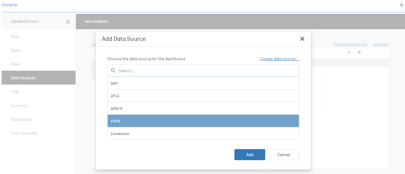 3. From the Dashboard menu select the Data Sources, and click Add to include the data sources to be used. In the data source list you will be able to identify the list of previously created data sources.