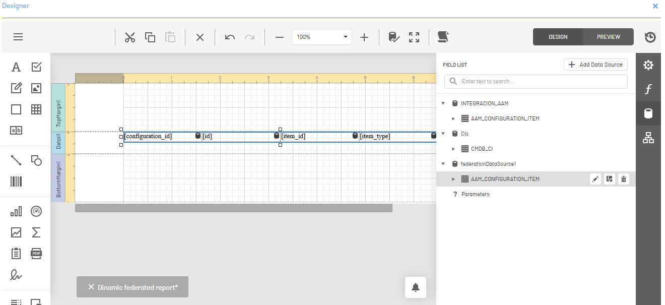 10. In the list of data sources, you can display the new federated query. Drag the fields into the report.