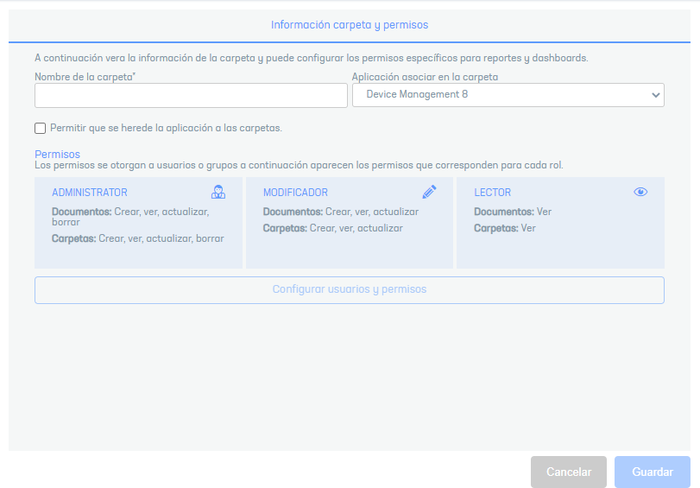 5. Na Exibição de Detalhes da Pasta, na seção Permissões, selecione o ícone Configurar usuários e permissões; A janela está habilitada onde você pode definir as funções por usuário/grupos para cada pasta, levando em consideração os seguintes itens: