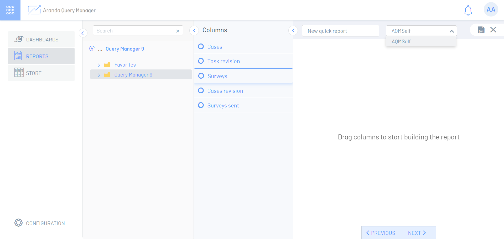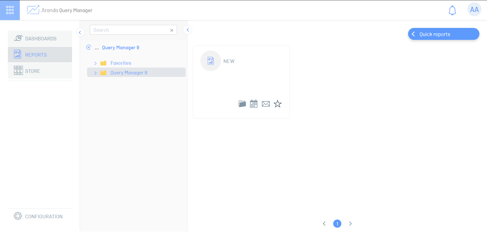 4. Na nova janela, os relatórios rápidos são listados; Você pode abrir ou excluir Relatórios Rápidos criados a partir desta janela. Selecione a opção de Novo relatório criar um novo e mover para o espaço de trabalho de relatório em branco.