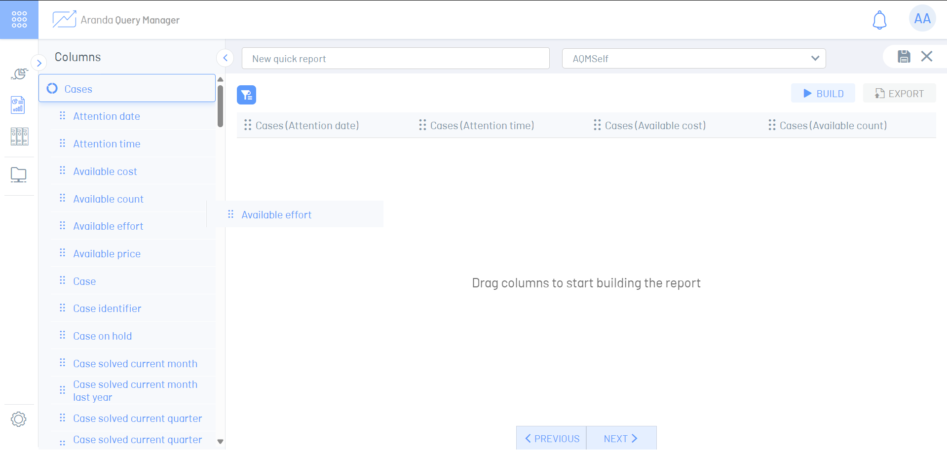 6. Na seção à esquerda, você pode encontrar o Modelos de Dados e seu Dimensões e Colunas, que você pode desdobrar, arrastar e soltar no espaço de trabalho.