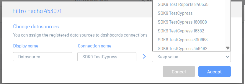 4. Se o painel que você está tentando importar não conseguir encontrar as fontes de dados, atribua a ele uma fonte de dados existente.