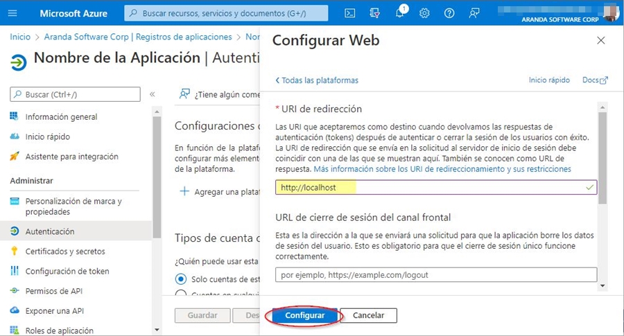 3. In the redirect URI field, we add the following value http://localhost, and then select Configure.