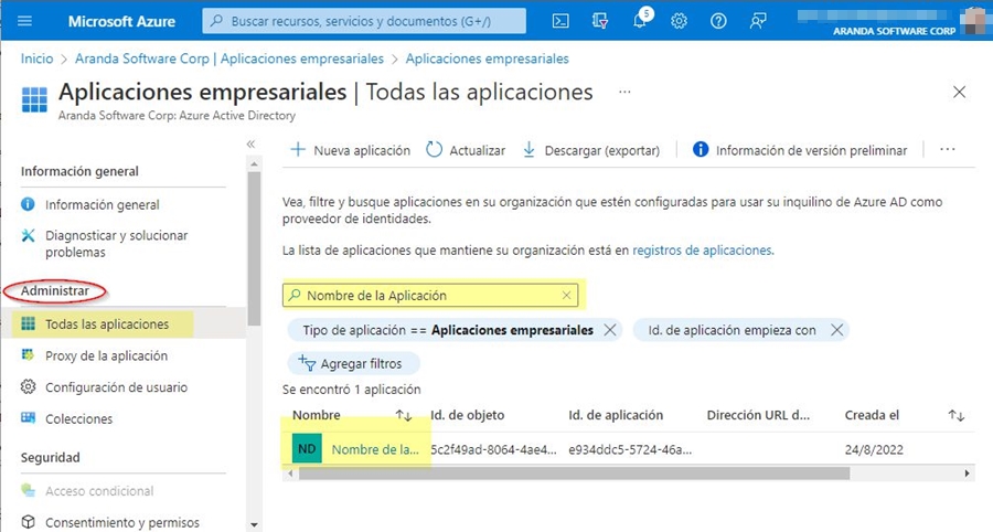 1. You enter the Azure portal> Menu> Azure Active Directory> Business Applications> select the created application from the list that appears in the view.