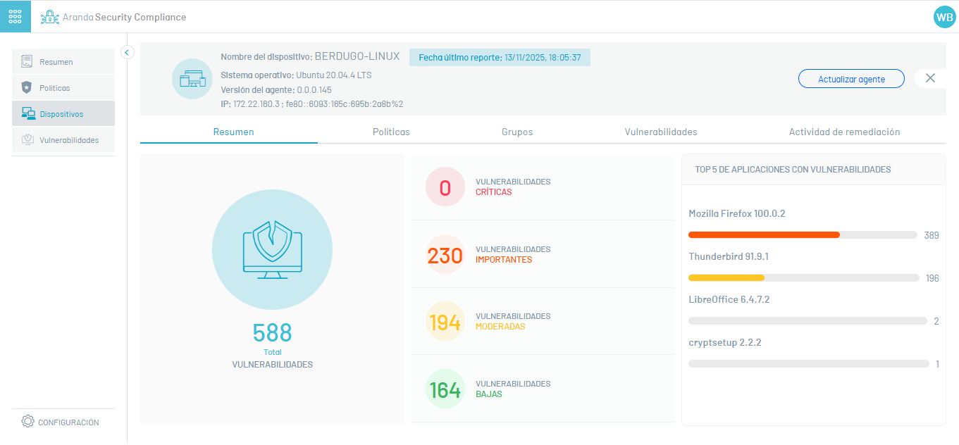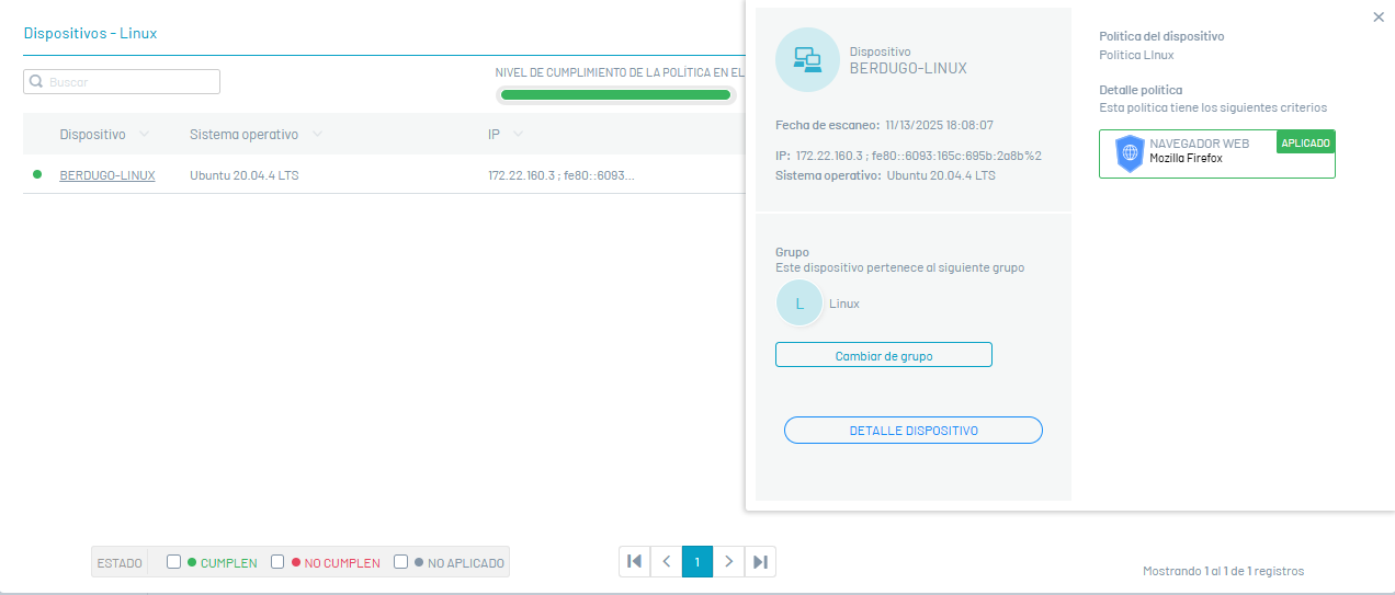 podrá visualizar en la ventana Dispositivos, los dispositivos asociados al grupo, ejecutar acciones de remediación, exportar el listado de dispositivos, y consultar el detalle de cada dispositivo.