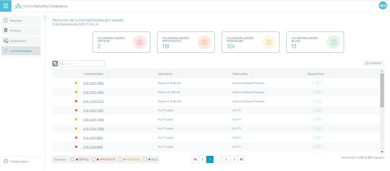 1. Enter the Aranda Security Compliance console, select the option Vulnerabilities from the main menu. In the summary view, you will be able to view the results of the analysis of the list of vulnerabilities classified by severity and grouped by devices