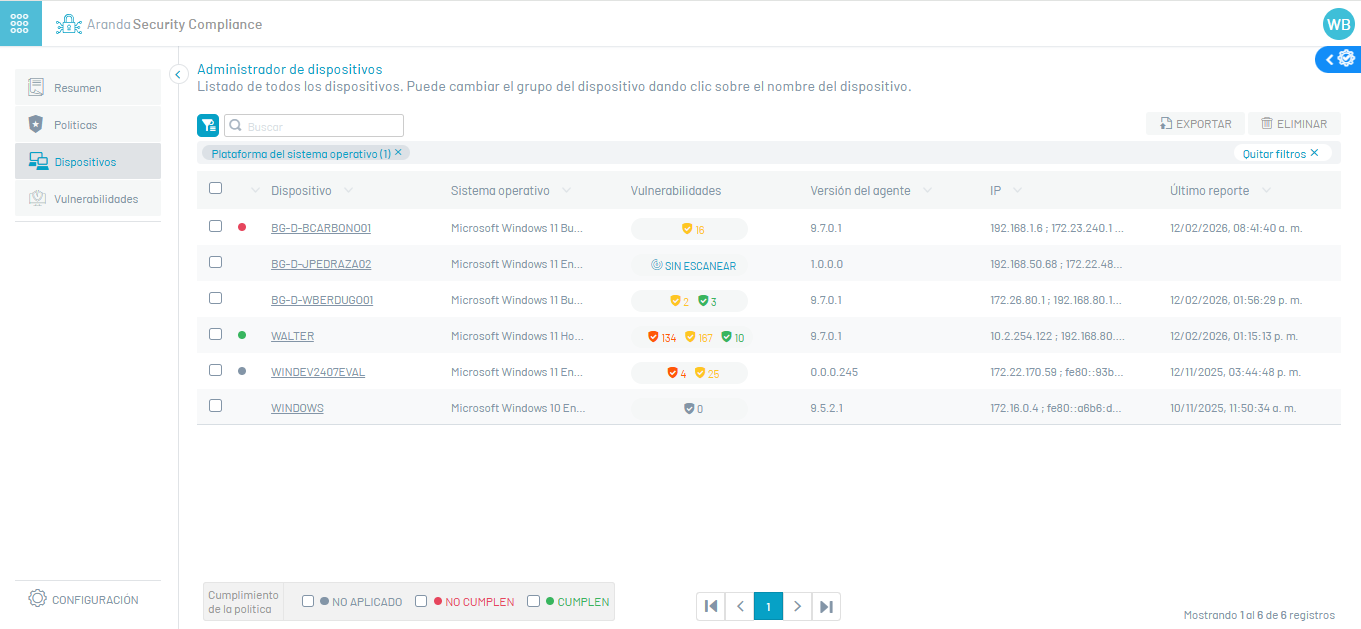 1. Entre no console de conformidade de segurança da Aranda com a função de administrador, selecione a opção Dispositivos no menu principal. Na visualização de informações, você pode visualizar a lista de dispositivos registrados por meio do Agente, mostrando o nome, o sistema operacional, as vulnerabilidades e o relatório de política mais recente.