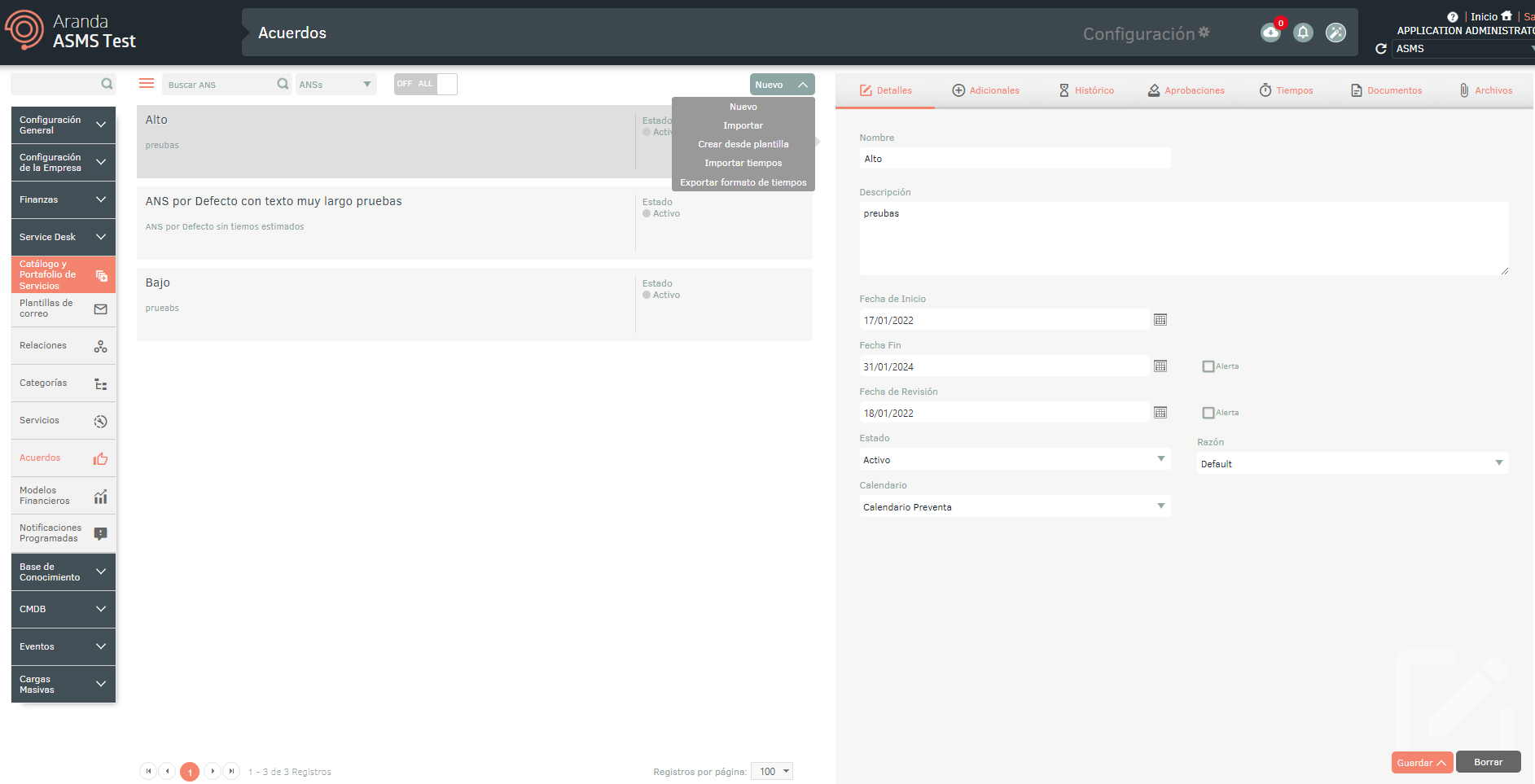 1. To perform the bulk time update, log in to the ASMS administration console, in the Catalog and portfolio of Services from the main menu, select the Agreements option. Define the project and type of agreement, finally select the New/Export format of times.