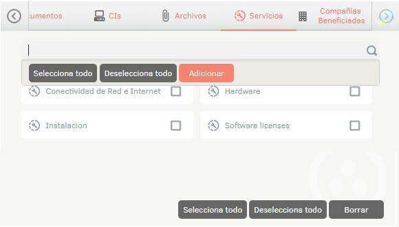 From the search bar it is possible to associate companies or organizational areas with the services. To do this, select the service and in the search box type the name of the company or organizational area and select it.