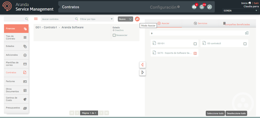 1 In the Contract Detail View in the ASMS Admin Console, select the tab To associate contracts with a project, log in to the ASMS Admin Console, in the Finance from the main menu, select the Contracts. Define a project, and in the information view, select the Associate Mode; This option will allow you to associate contracts from other projects with the project that is selected.