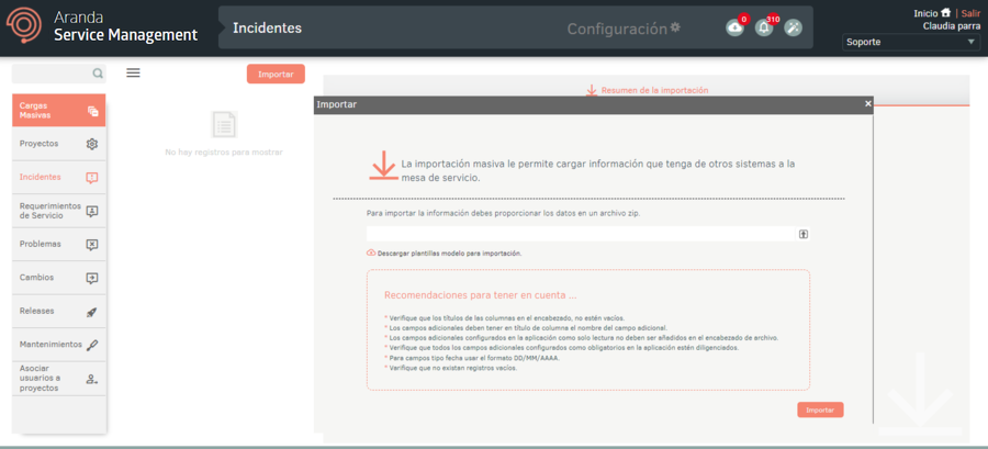 1. Para executar um upload de caso em massa, faça login no Console de Gerenciamento do ASMS, no Uploads em massa No menu principal, selecione o tipo de caso que você está carregando Incidentes/Problemas/Alterações/Requisitos de Serviço/Versões/Manutenção. Defina um projeto e, na visualização de informações, selecione o Importação para realizar os processos de carregamento em massa de informações.