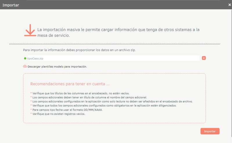 2. Na janela Importação Você pode baixar o modelo de modelo para importar tipos de caso (incidentes, problemas, alterações, requisitos de serviço, liberações, manutenção) selecionando o botão Descarga.