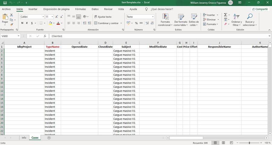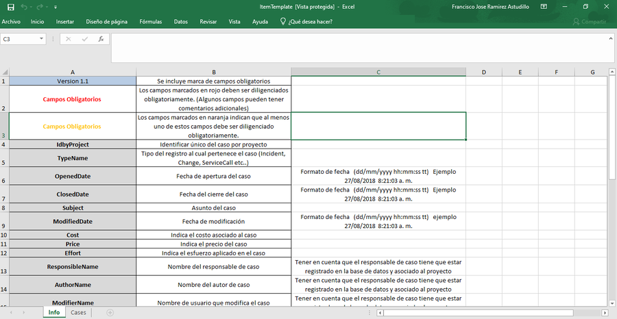 3. O arquivo Plantillas.zip que contém o formato será baixado ItemTemplate.xls Editar o arquivo e preencher as informações a serem carregadas em cada campo.