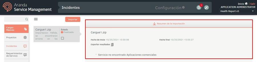 6. Caso haja erros durante a importação, as respectivas mensagens serão registradas no Resumo da Importação conforme mostrado abaixo: