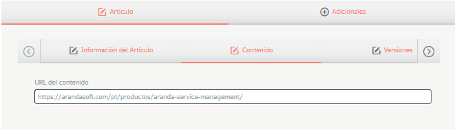Na Exibição de detalhes dos itens no Console de administração do ASMS, selecione o ícone Conteúdo Ao lidar com um artigo externo, esta guia exibirá um campo para inserir o link do artigo.