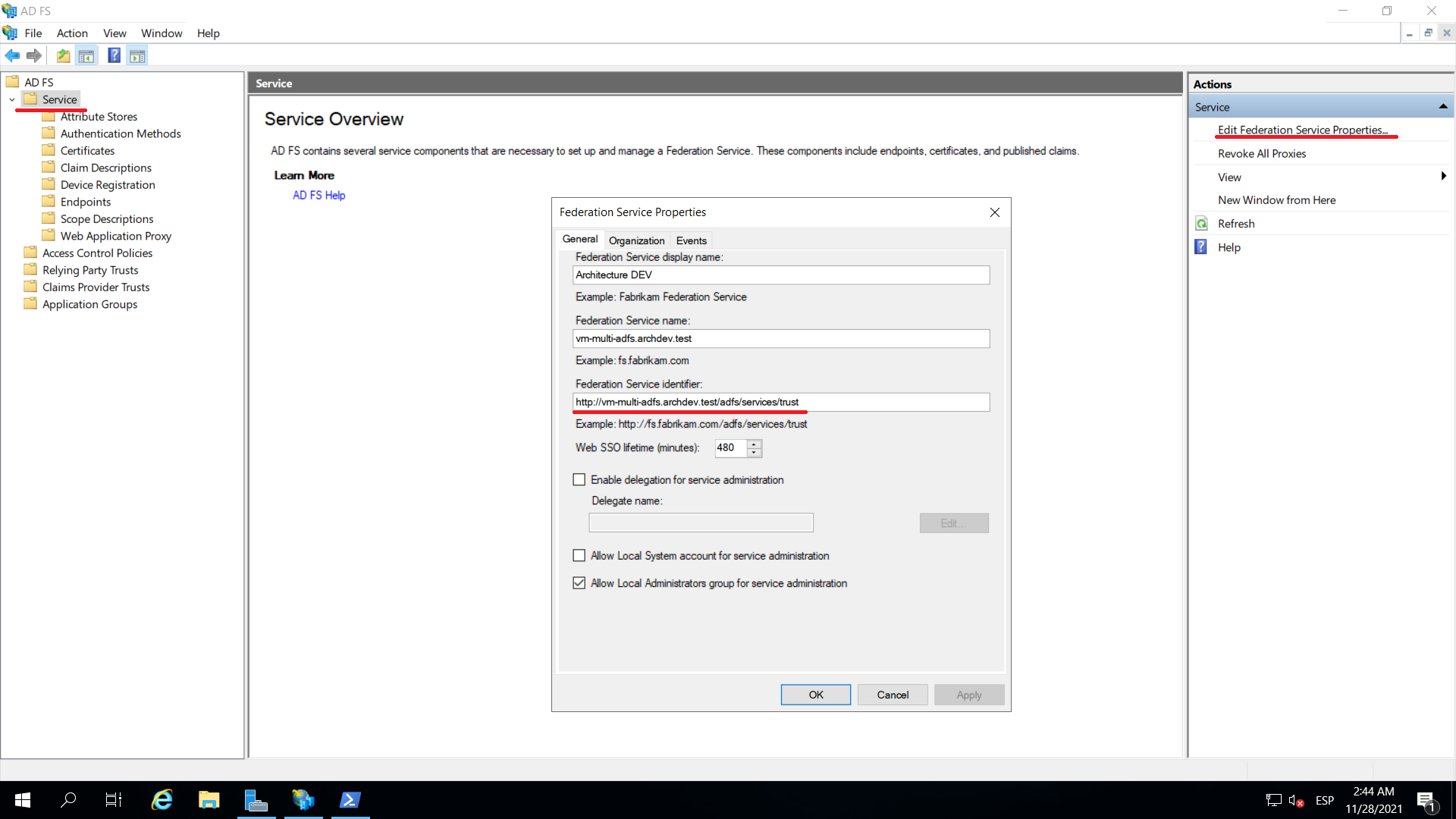 Esse identificador pode ser obtido diretamente do servidor ADFS abrindo o console Gerenciamento do AD FS, no menu principal, selecione o Serviço e, no menu Ações, selecione o Editar propriedades do serviço de federação à direita.