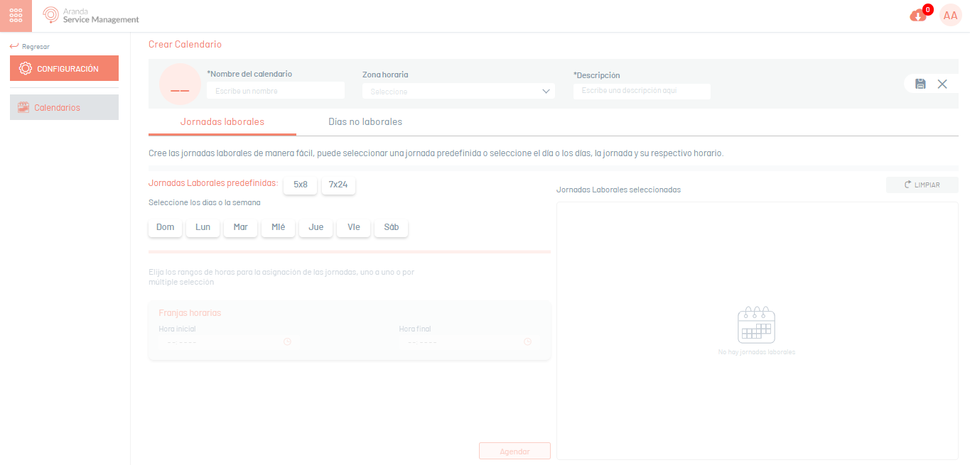 1. Para criar calendários, faça login no ASMS Admin Console, no Configurações gerais No menu principal, selecione o ícone Calendários. Uma nova janela será exibida onde os calendários criados serão listados, selecione o botão Novo e na visualização Criar calendário, você pode preencher as informações básicas do calendário, como nome, fuso horário e descrição.