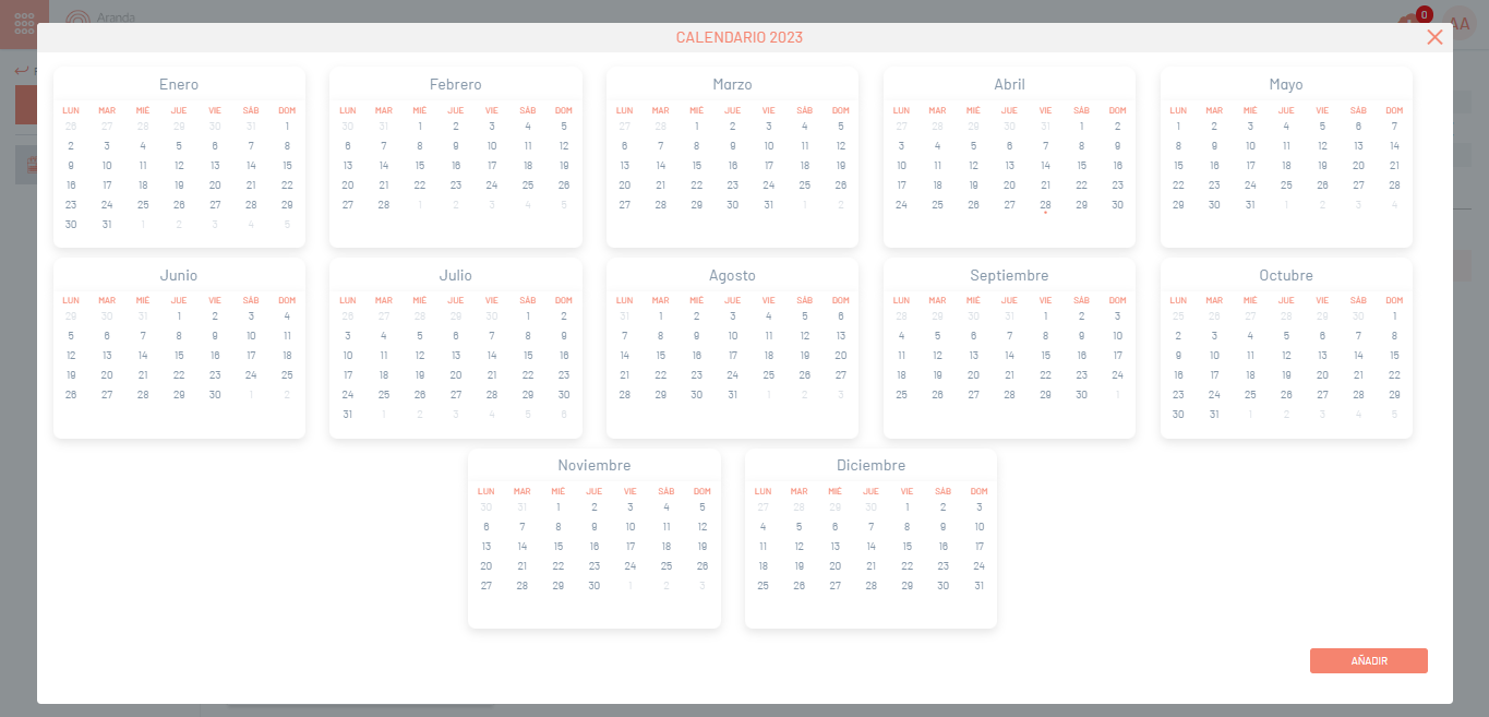 Para configurar o horário de trabalho que não estará disponível, você deve acessar o Dias não úteis, onde será exibido um calendário onde os dias não úteis podem ser adicionados 1 por 1.