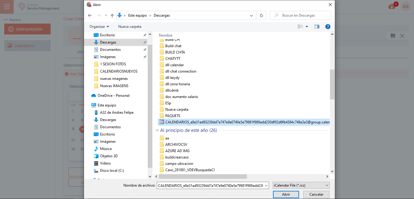 6. Para importar o arquivo isc, precisamos extrair o arquivo .zip, clicar em (Dias de importação. ICS) carregue o arquivo e importe.