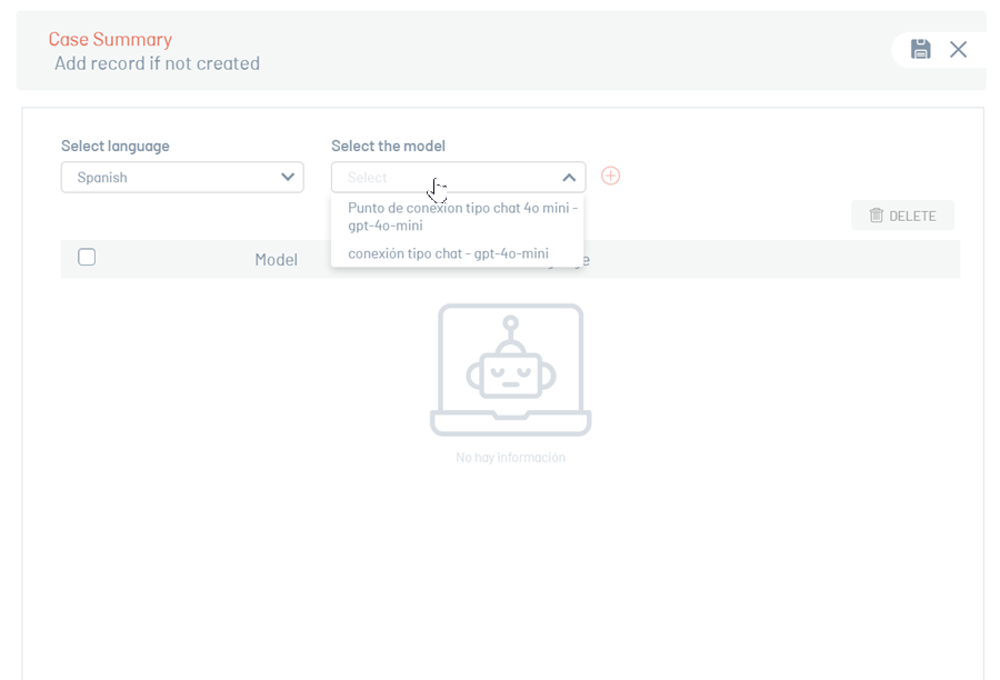 Selecione o idioma e o modelo (somente os modelos configurados durante a criação do ponto de extremidade de chat serão listados).
