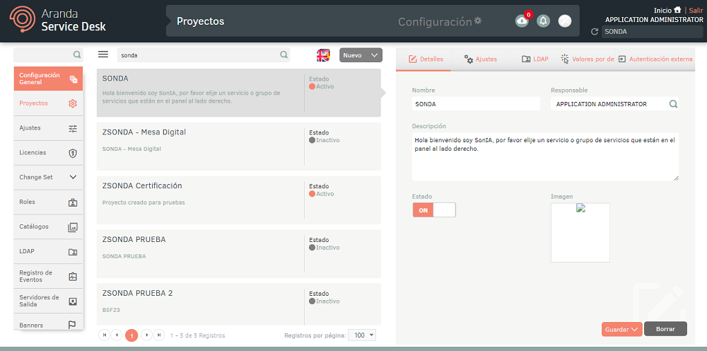 1. Para executar a configuração de integração de um projeto, acesse o Console de Administração do ASMS, na seção Configurações gerais No menu principal, selecione o ícone Projetos. Na visualização de informações, selecione um registro na lista de projetos.