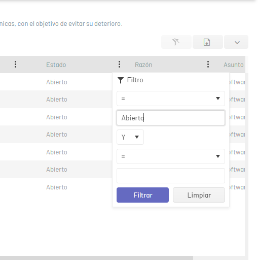 - Filtro de columnas : En los criterios de agrupación de información de los Mantenimientos, seleccione una columna y en la ventana que se habilita ingrese los parámetros de búsqueda y haga clic en el botón Filtrar. Tenga en cuenta que podrá aplicar varios filtros a la vez para una búsqueda más exacta.