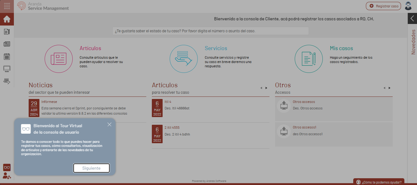 The guided tour provides windows where the basic contents and pertinent information of the Main functionalities of the console.