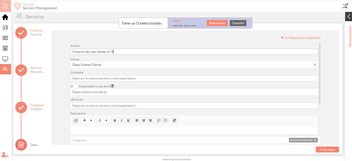 At the top, a label will be displayed with information about the CI selected. To associate it with the case being created, click the Select.