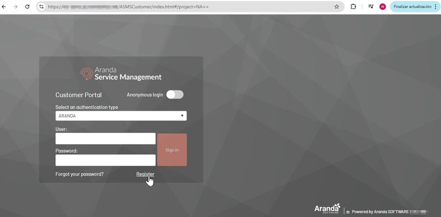1. Acesse o portal do usuário usando o link do projeto e clique no botão Registro.