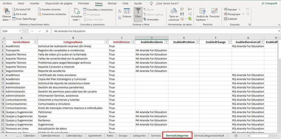 2. Nas colunas EnableIncidents, EnableServicall, EnableChange etc. Defina o nome do modelo que cada uma das categorias terá.