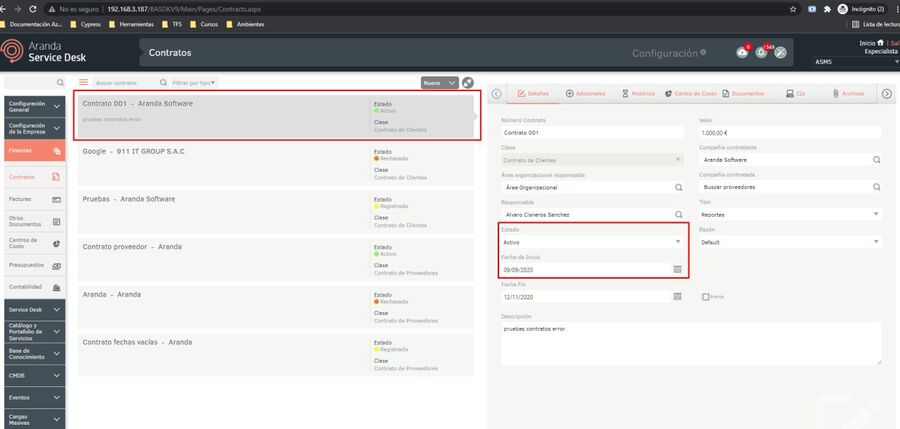 Na guia de detalhes, preencha os campos para criar um contrato cujo status seja “Ativo”, mas