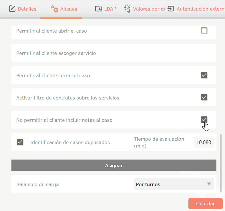 2. Nas configurações do projeto, selecione o tipo de caso apropriado e marque a caixa de seleção “Não permitir que o cliente inclua notas no caso”.
