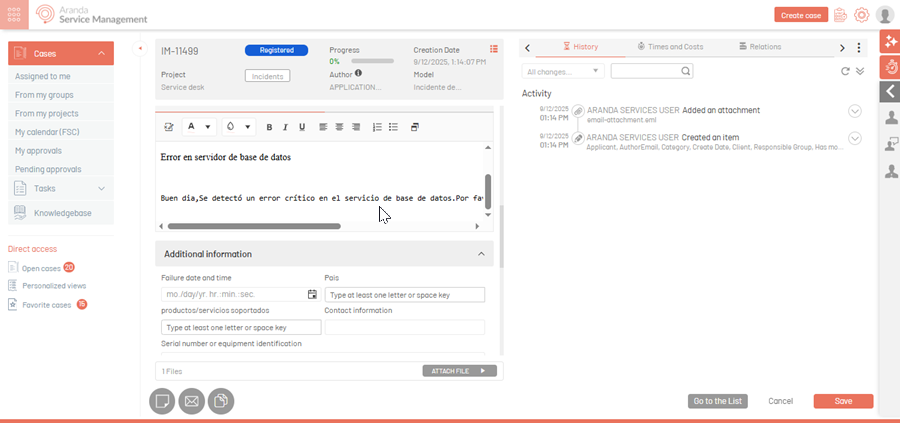 2. Una vez procesado el correo, el sistema crea el caso con la información enviada.