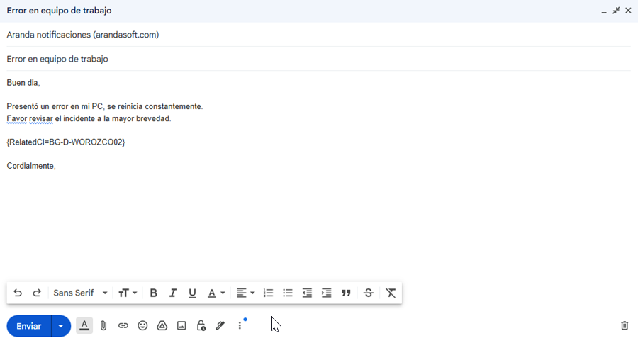 1. Redacte un correo dirigido a la dirección configurada para el servidor de entrada, indicando en el asunto un título breve del problema, describiendo el incidente en el cuerpo del mensaje e incluyendo el tag {RelatedCI=NombreExactoDelCI}.