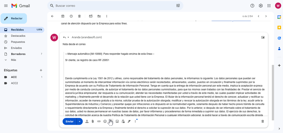 Quando o e-mail chegar à conta receptora, o Serviço de Trabalhadores da Aranda se encarregará de processar a mensagem junto com os anexos de e-mail, que serão anexados ao caso como público e fazer as alterações correspondentes no caso.