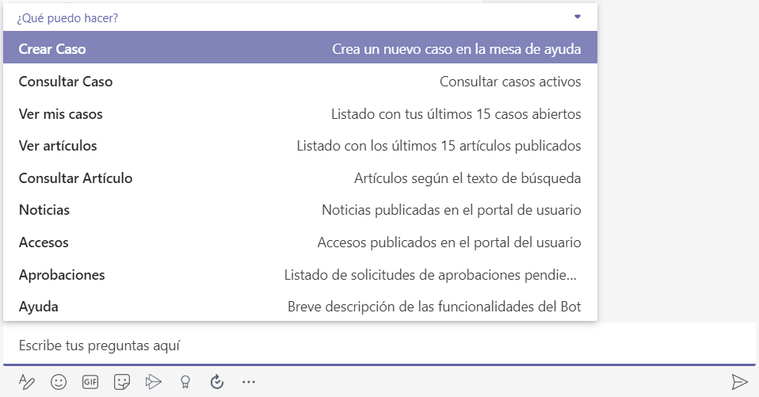 1. From the channel or chat authorized for this use, invoke the bot by typing “@Aranda Virtual Agent”, a drop-down menu will appear where you can select the option Create Case.