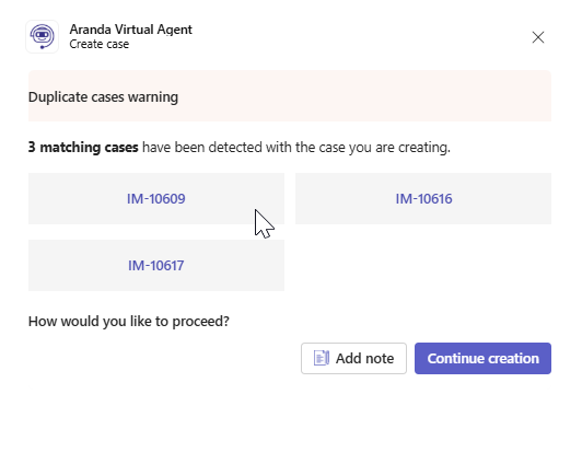 - Continue Creation: Allows you to continue with the creation of the new case, ignoring the warning.
