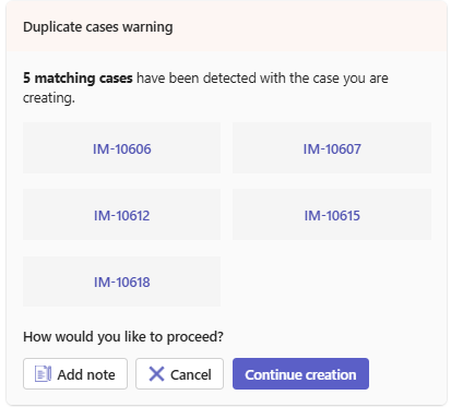 - Add Note: Allows you to add a note to previously created cases, detected as duplicates.