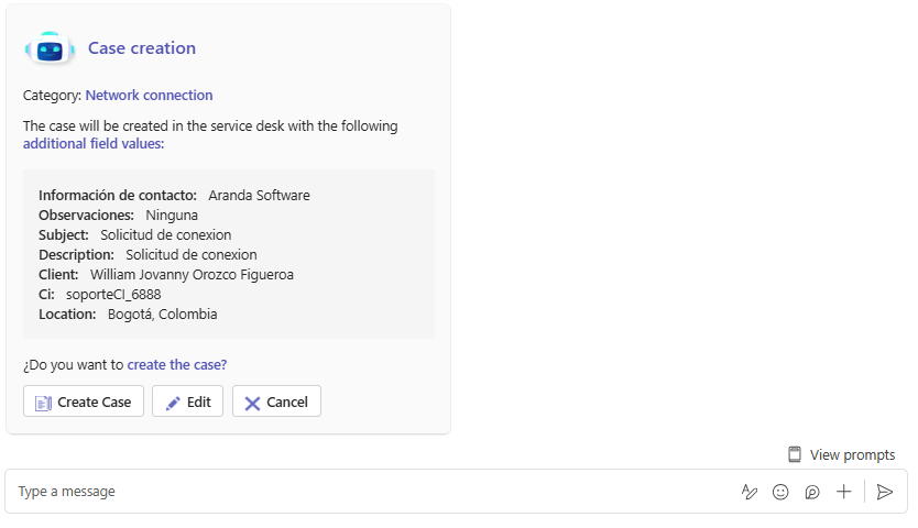 Once the case type is selected, the bot will sequentially prompt for the interface fields (CI, subject, description, and location), as well as the additional fields enabled for the category. This request will depend on the visibility, editing, and enforcement settings defined for each field.