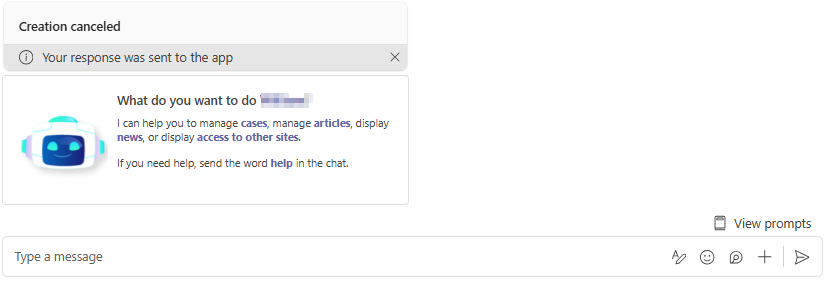 - Cancel: Cancels the interaction with the Create Case command and returns the initial message.