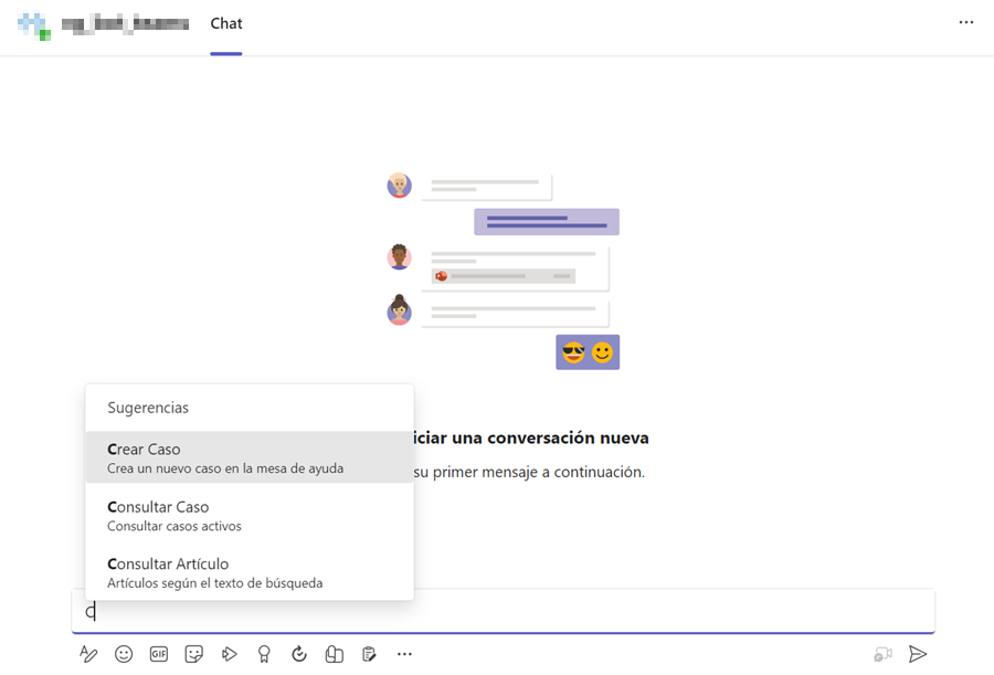 1. No canal ou chat autorizado para este uso, invoque o bot digitando “@Aranda Virtual Agent”, aparecerá um menu suspenso onde você pode selecionar a opção Criar caso.