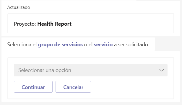 2. Selecione o projeto e clique em Continuar. O bot solicitará que você selecione um Grupo de Serviços ou um Serviço.