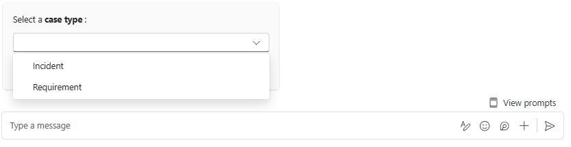 Se a opção de personalização do bot estiver habilitada “Pedir ao usuário campos adicionais ausentes” Exibir configurações personalizadas de bot, o bot solicitará que o usuário selecione o tipo de caso, caso a categoria esteja associada a mais de um tipo.