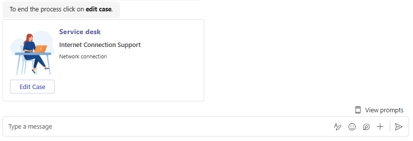 - Cancelar: Cancela a interação com o comando Criar caso e retorna a mensagem inicial.