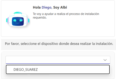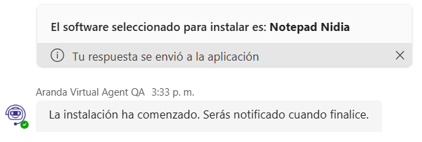 4. Uma vez selecionado o software, o Bot notificará em um cartão o software definido, seguido da notificação do processo de instalação.