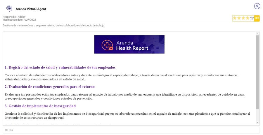 1. No canal autorizado para esse uso, invoque o bot digitando “@Aranda Virtual Agent”. Um menu suspenso aparecerá onde você pode selecionar a opção Ver artigos.