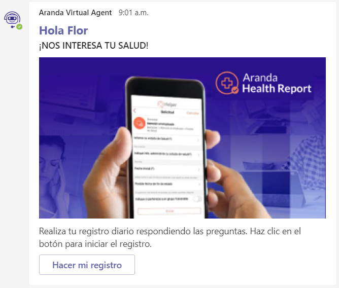 - If the checkbox (Enable sending notifications to MS Teams for health status logging) is enabled, Aranda DB Manager runs the notification sending process daily (Monday to Friday) at the configured time, and if users are found to send the notification, Aranda Push sends the notification to the Teams bot.