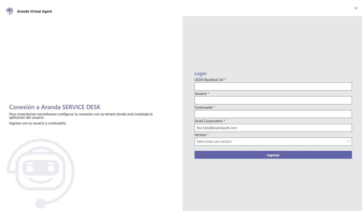 In this window, the Aranda administrator will be able to enter the requested data to access the configured connections (contact the Aranda Service Desk administrator to make this configuration).