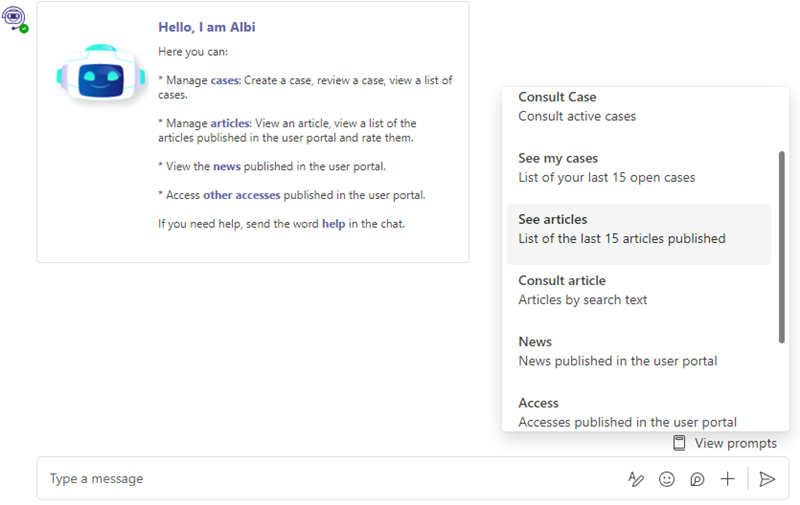 1. From the channel or chat authorized for this use, in the option View inquiries, a drop-down menu will appear where you can select the View Articles, alternatively you can type “view articles” and send the message to the conversation.