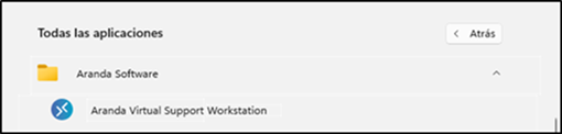 8. Verify that, in the Windows Start menu, in the All Applications, Aranda Software path, the ‘Aranda Virtual Support Workstation’ option is present. Select this item to open the Agent UI.
